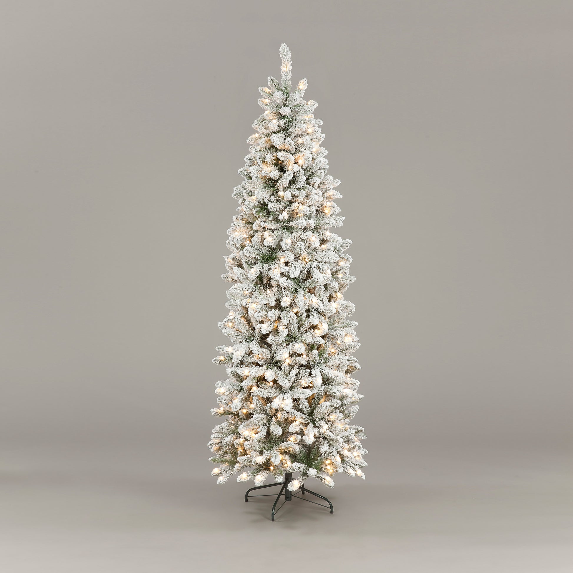 Experience the magic of an effortlessly decorated tree, even in small spaces, with our 7ft Pre-Lit Slim Snowshoe Spruce Artificial Christmas Tree. This stunning, all-in-one centerpiece combines a beautiful snowy finish with a space-saving design, making it the perfect festive addition to your home.