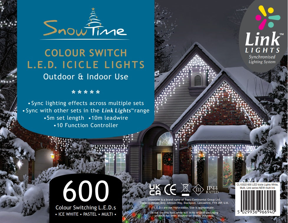 About SnowTime 600 LED Linkable Icicle Lights - Outdoor Colour Switching (White, Pastel, Multi)