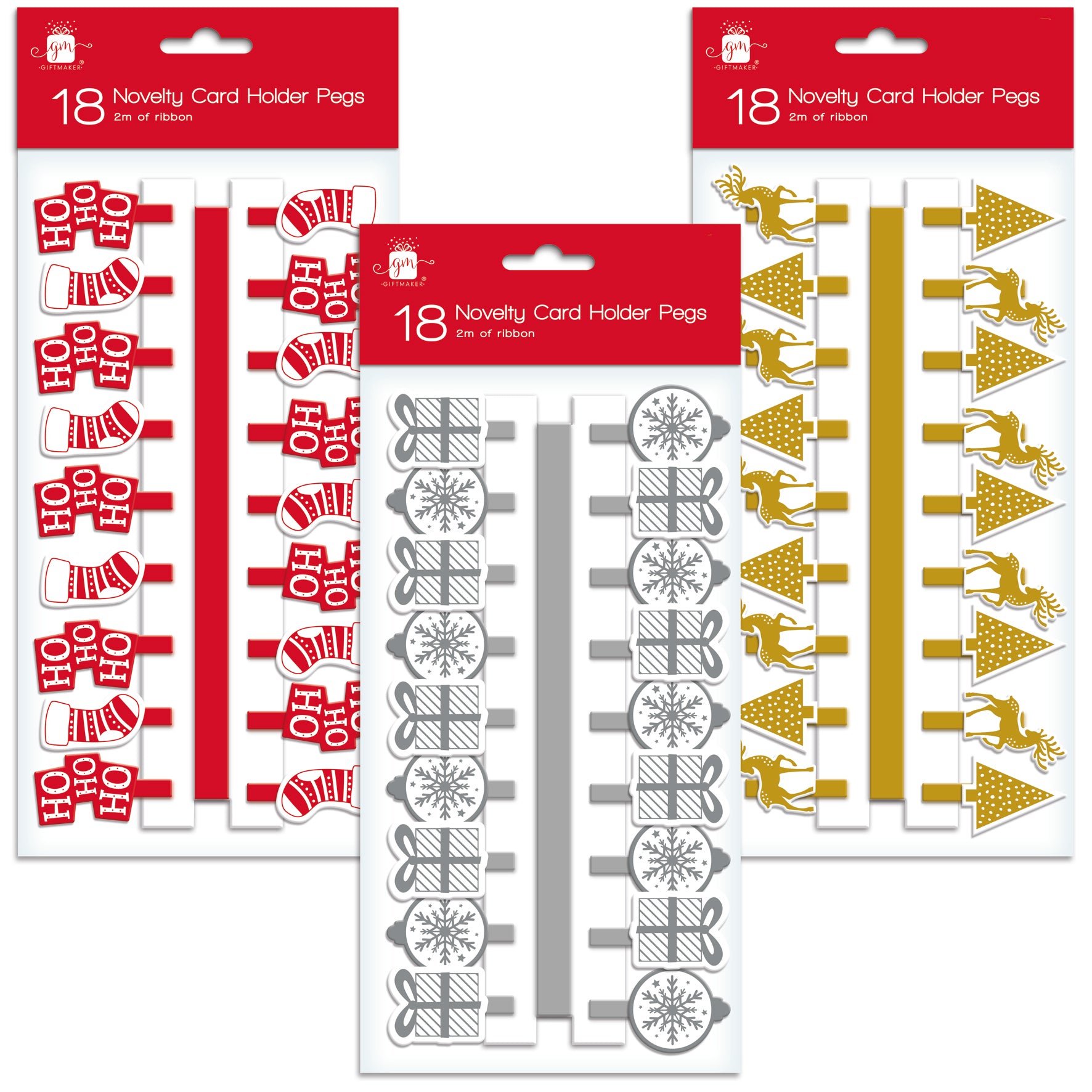 Add a festive touch to your holiday greetings with this pack of 18 novelty Christmas card holders. Featuring three charming designs—Red Stockings, Silver Presents, and Gold Reindeer—these card holders come with 2 meters of ribbon, making it easy to display your cards beautifully around your home. Perfect for creating a warm, seasonal atmosphere, they bring both practicality and holiday cheer to your celebrations. Choose your favourite design and showcase your Christmas cards in style.