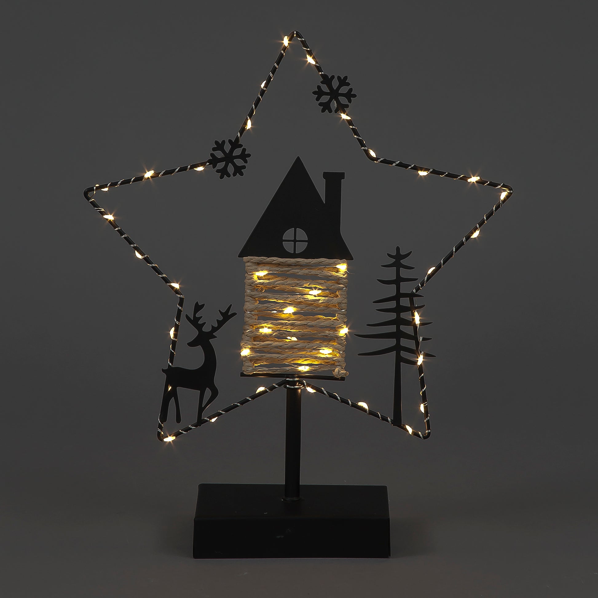 Crafted from black metal, the 31cm tall star holds a beautiful silhouette scene of a house, a deer, and a pine tree. Warm white LEDs are wrapped around both the star's frame and the rope-detailed house, creating a stunning dual-lighting effect and a warm, inviting ambiance. Best of all, it features a handy built-in timer, so you can set it once and enjoy a hassle-free glow every evening.