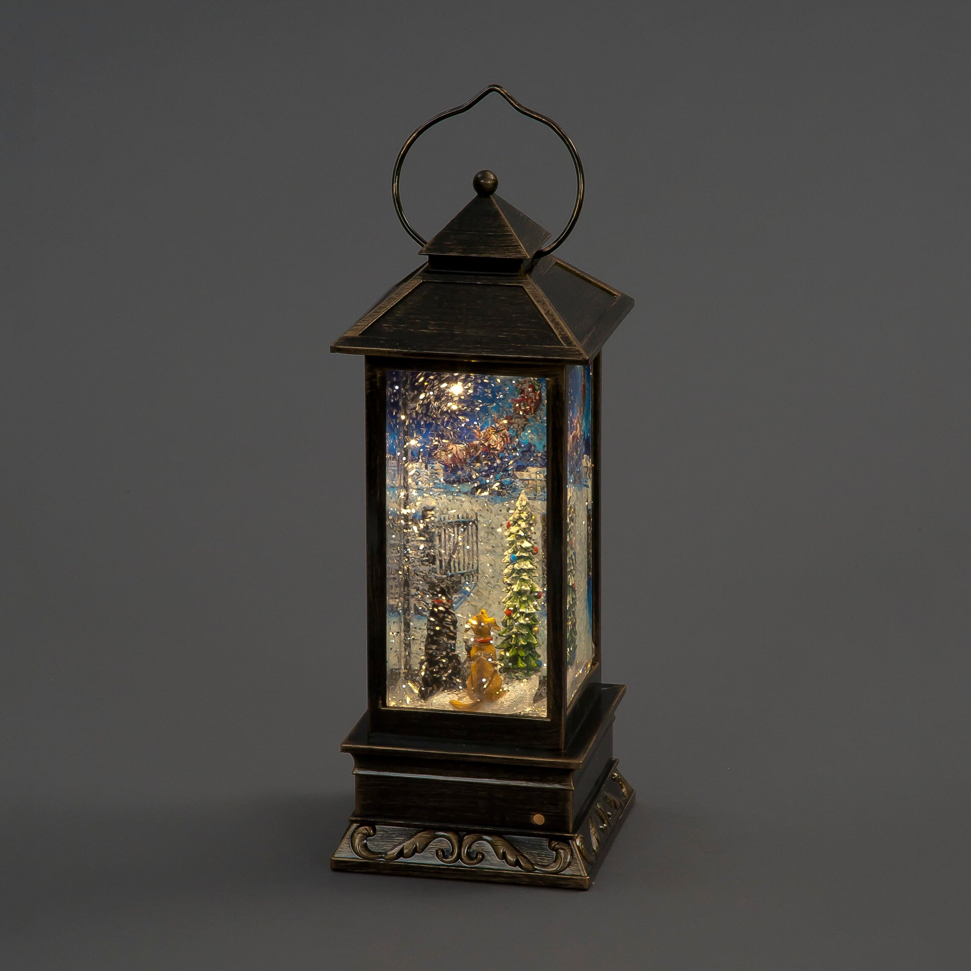 This enchanting 31cm lantern showcases the charming scene 'Cats & Dogs Watching Santa', where furry friends are gathered at the window in excited anticipation of his arrival. When you switch it on, the scene is illuminated by a warm white LED, while a hidden motor sends a flurry of glittering flakes swirling around, creating a continuous and magical snowstorm effect.