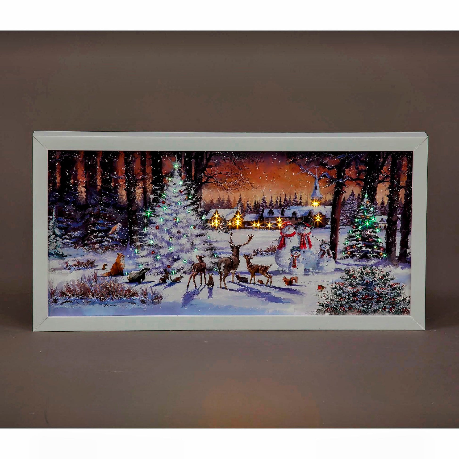 The canvas features a heartwarming scene of woodland animals and snowmen gathered around a sparkling Christmas tree, with a cosy village glowing softly in the background. The artwork is brought to life with a magical combination of lights: warm white LEDs give the village windows a welcoming glow, while twinkling fibre optics or cool white LEDs make the Christmas trees sparkle.