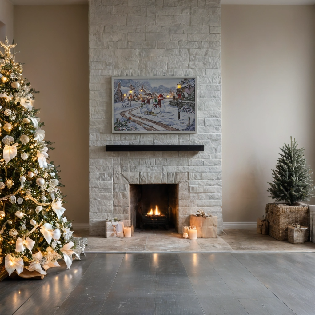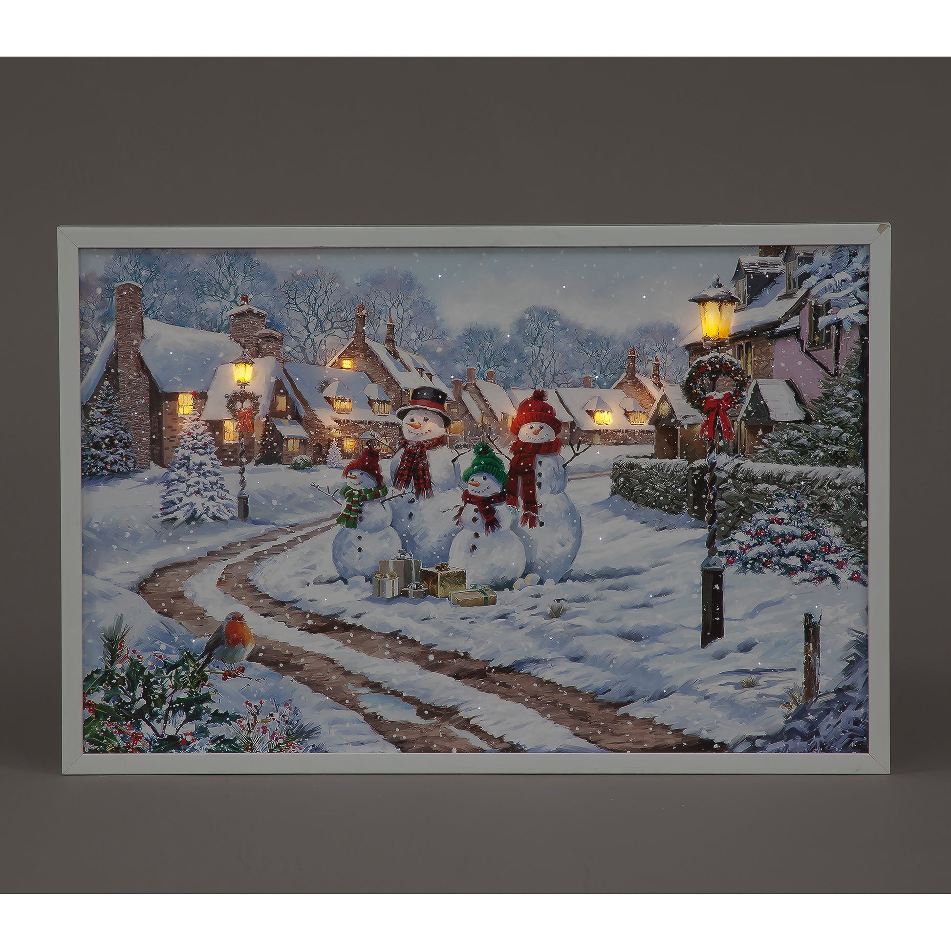 Add a touch of warmth and magic to your festive decor with this beautiful Light-Up Christmas Canvas. Featuring the heartwarming "Snowfamily" artwork by acclaimed artist Richard Macneil, this piece captures the joy of the season. A cheerful snowman family is depicted in a snowy winter scene, brought to life by twinkling LED lights that create a magical, ambient glow.