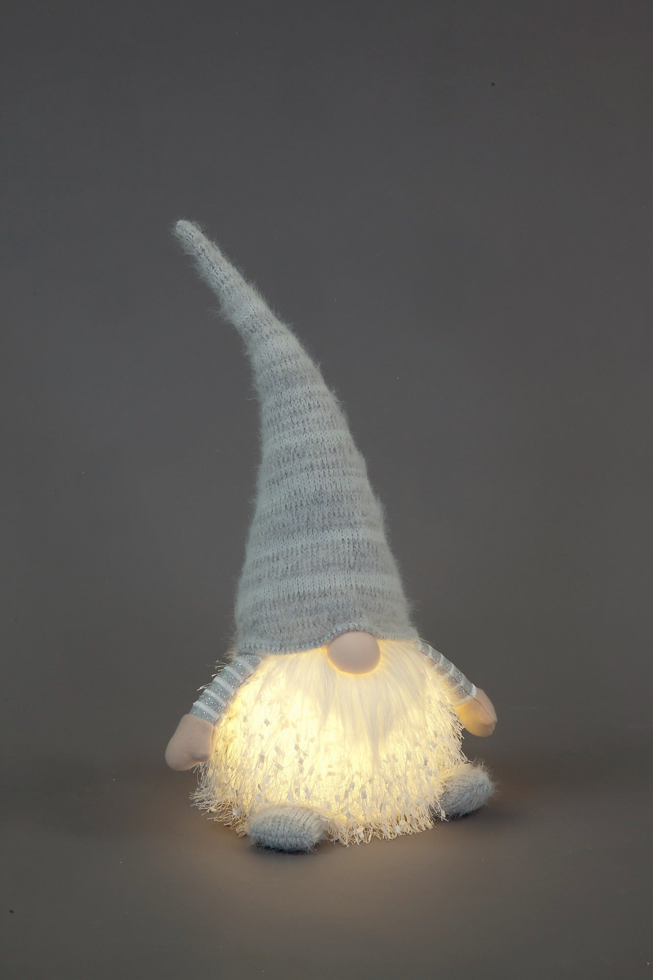 With his tall, knitted pale grey hat pulled down over his eyes, all you can see is his sweet button nose and a magnificent fluffy white beard. With the flick of a switch, gentle LEDs from within illuminate his beard, casting a soft and cosy light. His weighted, legless design makes him the perfect 'shelf sitter', ready to take his place on your mantelpiece, windowsill, or guarding the fireplace.