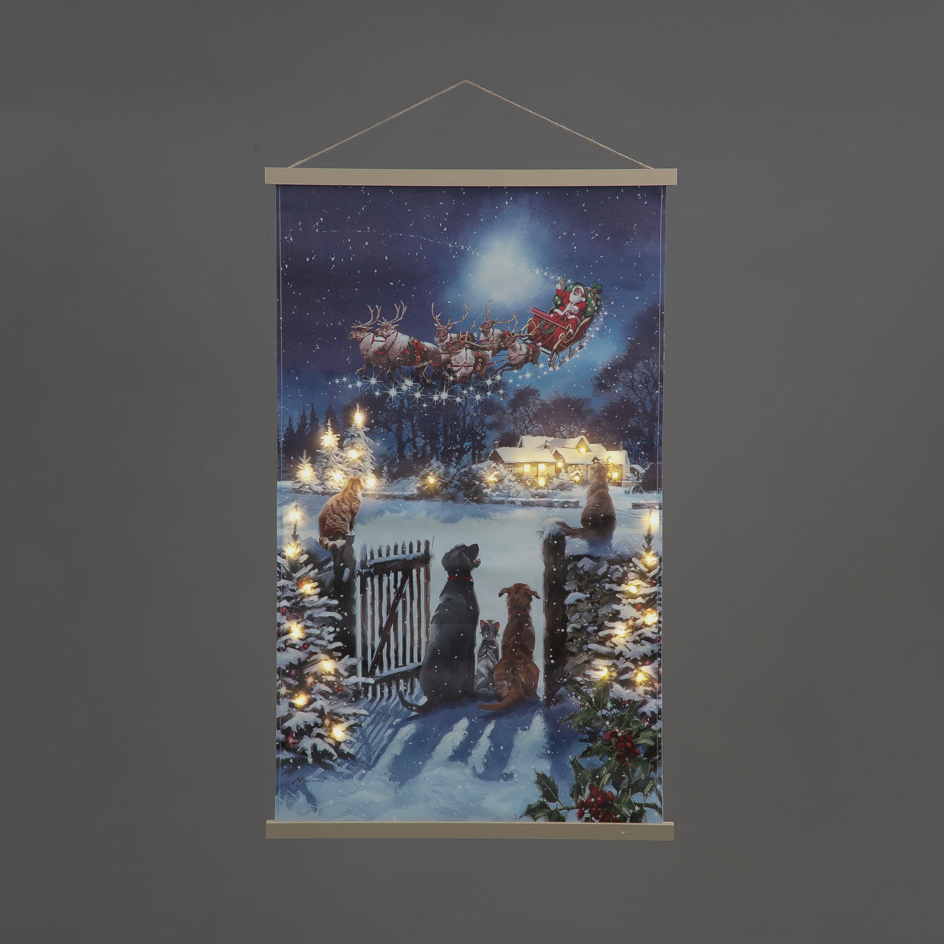 About LED Light-Up Christmas Tapestry | Cats & Dogs Santa Scene Wall Hanging
