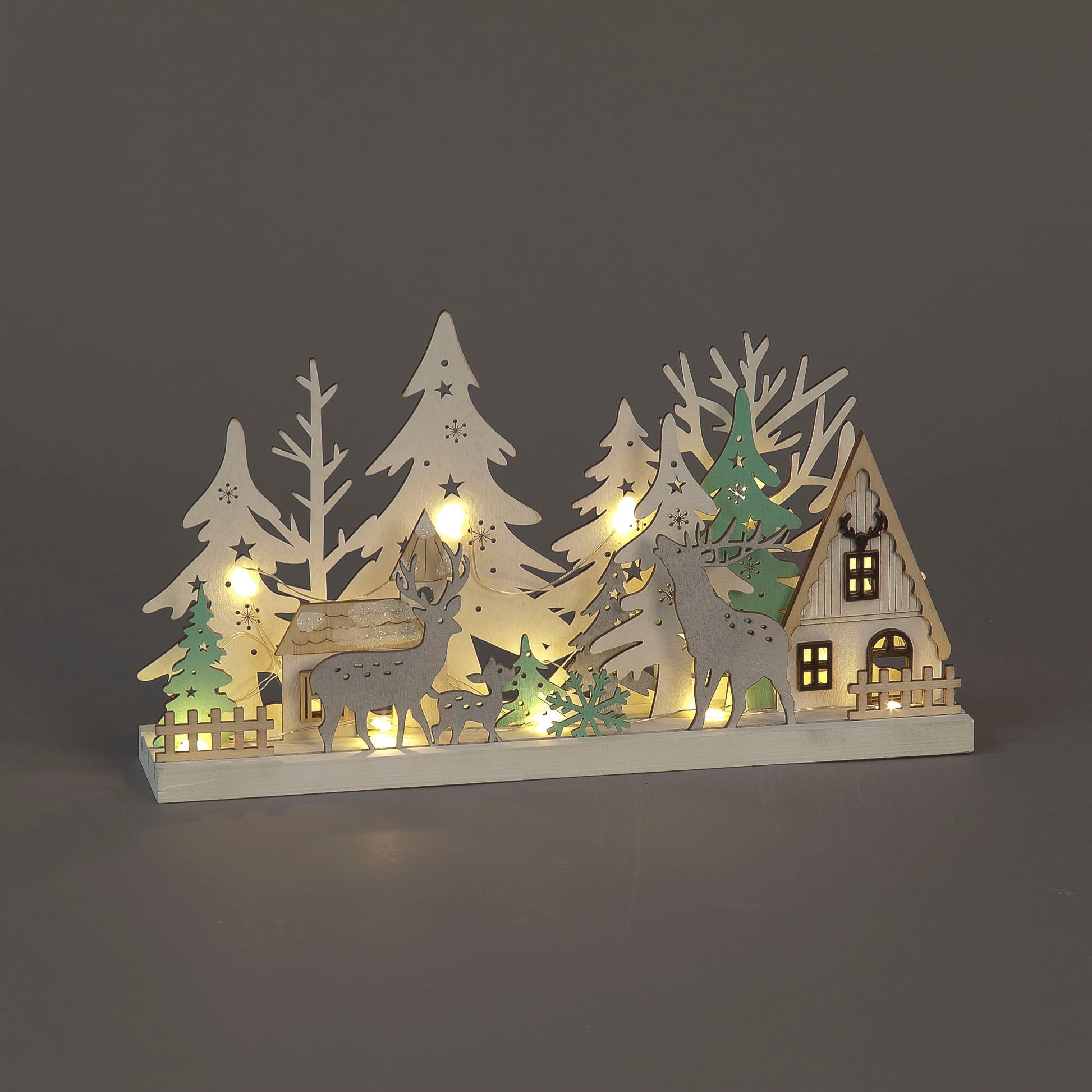 This intricate 17cm ornament features a classic winter scene, depicting a family of deer in the woods beside a welcoming family home. Crafted from wood, the scene is brought to life by warm LEDs that shine from within, creating stunning silhouettes and casting an inviting glow that gives an extra boost of Christmas spirit.