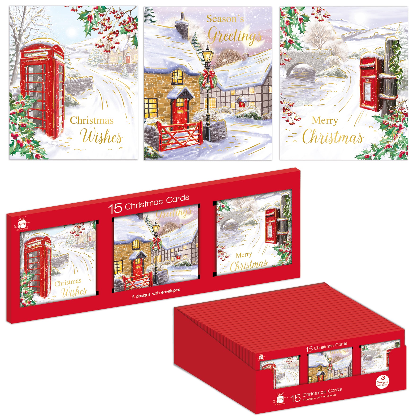 Celebrate the festive season with this set of 15 Christmas cards featuring three vibrant traditional designs. Each card captures classic holiday scenes that bring warmth and cheer, perfect for sharing heartfelt wishes with family and friends. Brighten someone's day with these charming cards that embody the spirit of Christmas.